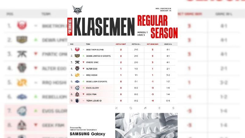 Simak di sini, klasemen MPL ID S14 week 1, di mana, Bigetron (BTR) Alpha kokoh berada di pucuk, sedangkan Team Liquid ID #9.